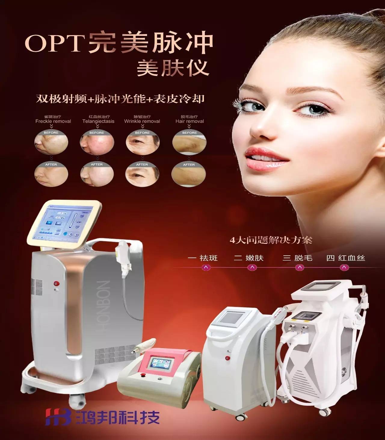 鴻邦公司作為美容科技行業的后起之秀,始終堅持“以服務贏取客戶、以品質創造品牌”的核心理念,打造最具創新力和競爭力的美容科技品牌。公司產品覆蓋激光、E光、微波、射頻、超聲等多技術領域,產品包括激光色素治療儀、光子嫩膚儀、射頻治療儀、微光能豐胸儀、化蝶治療儀、化妝品等多個系列的產品。