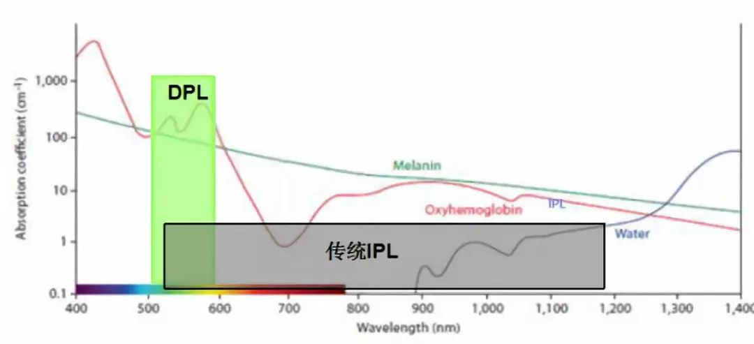 新型窄譜DPL徹底祛除光學(xué)窗口,能量集中在靶色基吸收高的波段的100nm波段,對(duì)比傳統(tǒng)寬譜IPL療效更強(qiáng),療程更短,同樣安全。